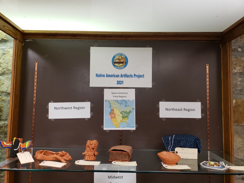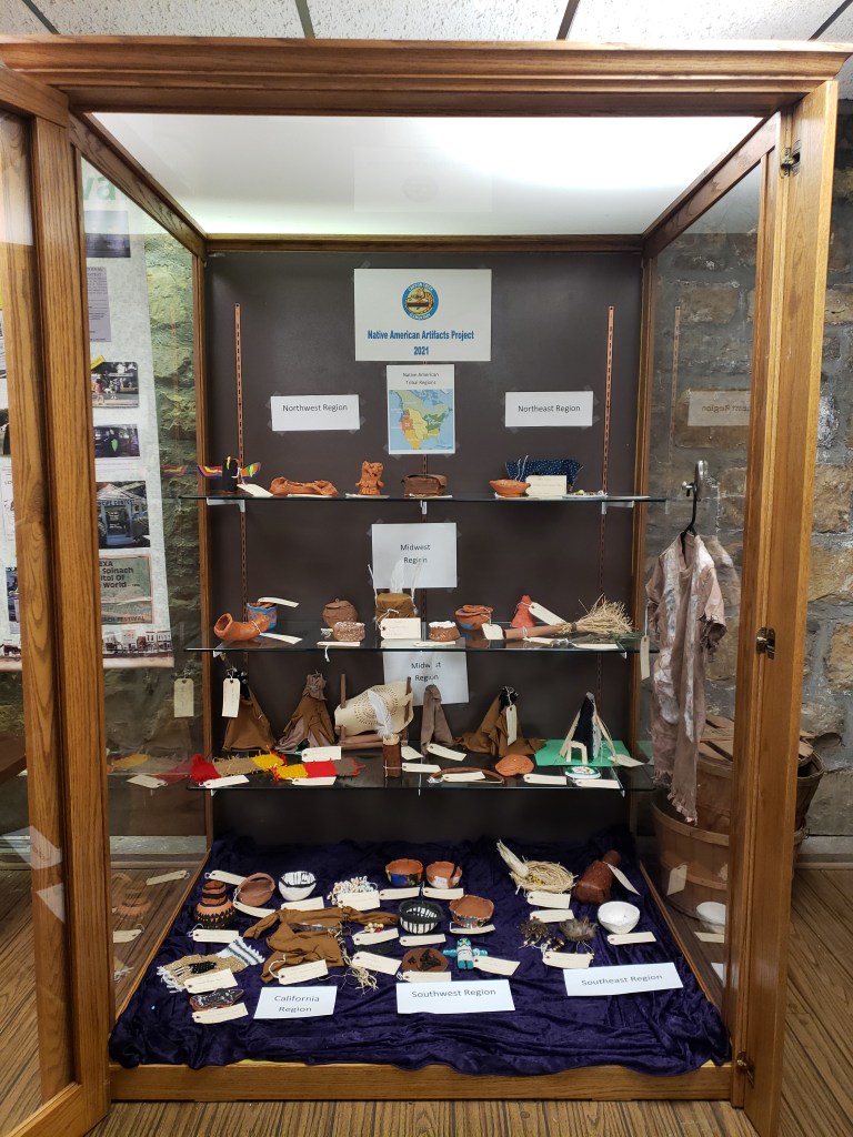 Each artifact went through a mini archival processing procedure. They were cross-checked with the source (in this case, the student who created it) to make sure each one stayed with the proper name and information, the region was checked, and nomenclature was established based on how the student described the item. All items were organized first by region (simplified to Northeast, Northwest, Southeast, Southwest, and West) and then in alphabetical order by the student’s last name. Once this was established, a unique cataloging system was created to connect the artifact to the artist statements accompanying them, and to set them apart from the permanent artifacts of the museum. Finally, a tag was created for each artifact containing the above information and attached to the items. Some simple signs were created for the display to help viewers identify what they are looking at without taking away from the artifacts themselves. The Artist Statements written by the students are available next to the exhibit case for interested visitors to read.