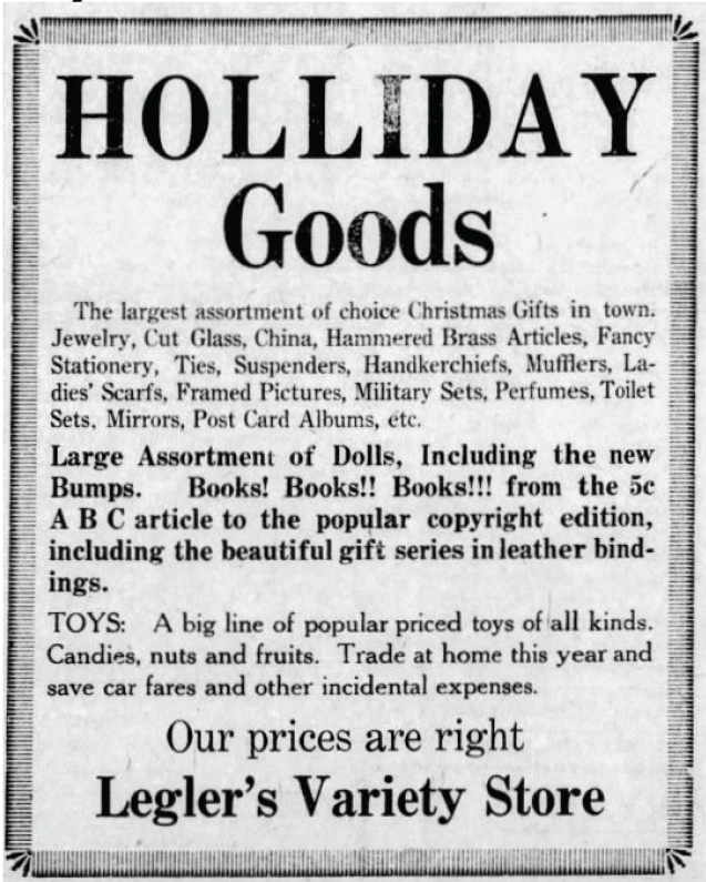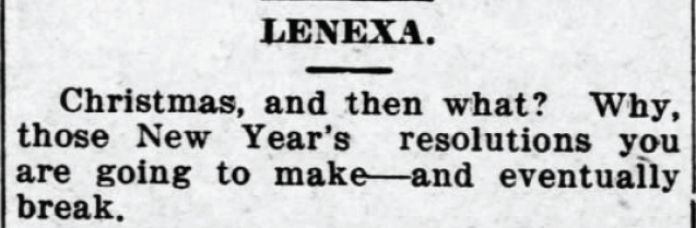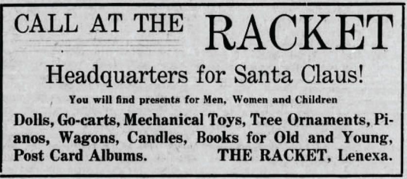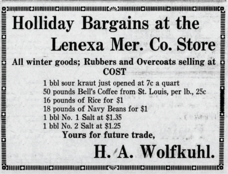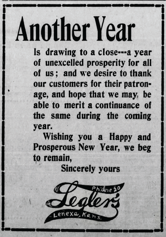So open up your copy of the 1907 Lenexa News, relax in a comfy chair near the fireplace, sip your hot chocolate (or hot toddy), and peruse these messages from Lenexa merchants of yesteryear.