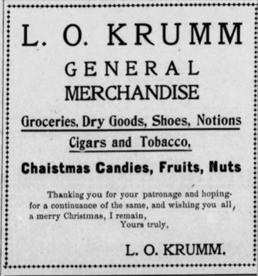 At the beginning of 1907, a man named R. N. Mills opened his own blacksmith shop inside of Mathias’s building2. During that time, Mathias’s son, Louis O. Krumm, worked as “a popular clerk” at the dry goods store operated by the Bradshaw Bros. In August of 1907, Louis O. decided to start his own general merchandise store, taking over his father’s old blacksmith stand from R. N. Mills3. He reorganized the store, painted it and opened Krumm’s Store for business.